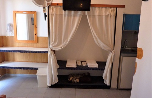 1-2 Person studio with sea view is a private room (non shared), with private bath/ toilet with hairdryer. You may prepare your food at the kitchenette including refrigerator & cooking hobs, cooking pot, eating facilities (plates/ forks etc). More electric equipments are toaster, water kettle, electric coffee pot for Greek/Turkish coffee.