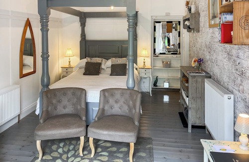 Step through the inviting French doors into the spacious living/bedroom adorned with a sumptuous king-size four-poster bed, flanked by two plush tub armchairs and a Smart TV, creating a cosy sanctuary for relaxation. The en-suite shower room boasts a rejuvenating rain shower, complemented by luxurious amenities including a heated towel rail, soft bathrobes, and indulgent Scottish Fine Soap toiletries. Adjacent to the living area, the charming kitchenette beckons with its quaint ambience, serving as both a culinary hub and a dining retreat. Equipped with essential amenities, it offers a perfect setting for intimate meals. Draw the curtain and immerse yourself in the serene ambience, savouring delicious dishes and fine wines.