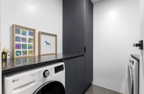 The modern kitchen is fully equipped for all your culinary needs, featuring a Nespresso coffee machine, microwave, Smeg kettle and toaster, French-door Fisher & Paykel fridge, and a dishwasher. Additional appliances include a rice maker, toastie machine, and Ninja smoothie maker. You'll also find wine and champagne glasses, a full range of cooking equipment, and family-friendly extras like a highchair and baby bath. A Dyson hand vacuum is also on hand to help keep things tidy throughout your stay.