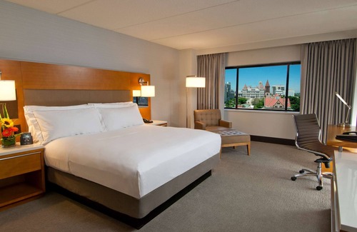 1 King Bed650-sq-foot room with river views Layout - Bedroom, living room, and sitting areaInternet - Free WiFi Entertainment - 42-inch LCD TV with premium channels, pay movies, MP3 dockFood & Drink - Refrigerator, coffee/tea maker, and microwave (on request)Sleep - Pillowtop bed, premium bedding, a down duvet, blackout drapes/curtains, and bed sheets Bathroom - Private bathroom, shower, free toiletries, and a hair dryerPractical - Sofa bed, free local calls, and laptop-compatible safe; rollaway/extra beds and free cribs/infant beds available on requestComfort - Climate-controlled air conditioning and daily housekeepingAccessibility - Closed-captioned TVNon-SmokingConnecting/adjoining rooms can be requested, subject to availability Located within walking distance of the New York State Capitol Building, the hotel ensures your next visit to Albany a breeze with a shuttle service to Albany International Airport and Amtrak station, as well as on-site car rental. Savor delicious American cuisine at the Charter Restaurant, or enjoy a selection of local brews and handcrafted cocktails until 1:00 am at Sessions Lounge. Swim laps in the heated indoor pool, or squeeze in a workout using the fitness center's free weights and cardio machines. Get some work done at the 24-hour Connectivity Station, or relax in peace on a Quiet Zone floor. For meetings and conferences, hotel boasts 31 meeting rooms with over 30,000 square feet of meeting space.