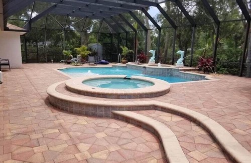 Step into the backyard paradise where a large swimming pool invites you to take a refreshing dip. Unwind in the hot tub, savor a delicious meal at the grill area, and rinse off under the open sky with the outdoor shower. Whether you're basking in the Florida sun or stargazing in the evening, this home provides the ultimate retreat for relaxation and enjoyment.