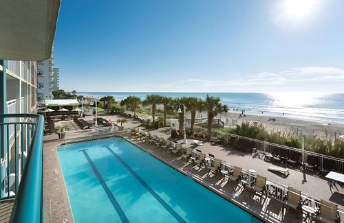 Wake up to serene ocean views and endless adventure along Myrtle Beach's vibrant coastline. Just a short drive from the airport, this oceanfront gem offers direct beach access, a relaxing lazy river, and nearby fun at Family Kingdom Amusement Park. Stroll the Myrtle Beach Boardwalk or soar on the SkyWheel.