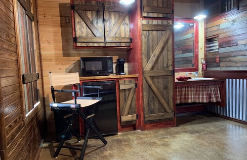 After a fun filled day being in nature, wind down your day at The Lazy Buffalo. Nested at the foothills of the Wichita Mountains and just over 2 miles from the entrance to the Wildlife Refuge. Each Cabin offers a spacious walk in tiled shower. Knotty pine and corrugated tin are used throughout each Cabin. The wood tiled floors paired with the tin ceilings throughout really add a rustic touch. Each Cabin has a kitchenette area with a mini fridge, microwave, k cup coffee along, along with table and chairs.