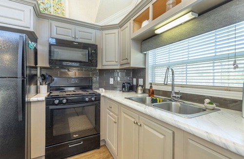 This Park Model tiny home is located in Acony Bell Tiny Home Village and is a 380 square feet tiny home. This home sleeps six with two bedrooms and a pull-out couch. Master bedroom is on the main floor with a smart TV. The loft bedroom is accessed by steps(steep). It has a full kitchen with standard size oven and refrigerator and open floor plan to living room. The bathroom that has a double head shower!