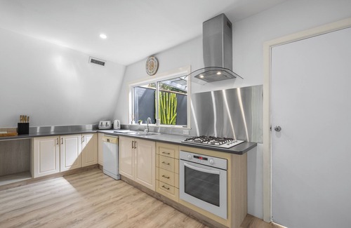 The bedrooms are split over two levels, with one queen bedroom located downstairs and the other two bedrooms upstairs - one with a queen bed and the other with a double bed. There's even an outdoor shower off the garage, perfect for washing away sand from your trip to the nearby beach.