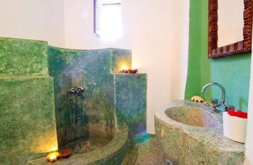 It features a green stone bathroom with a shower and hand wash basin made of terrazo polished stone.