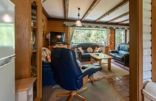 3-room apartment 75 m2, on the upper floor. Cosy and wooden furniture furnishings: living room 35 m2 with open-hearth fireplace (only for decoration), satellite TV (flat screen), CD-player, hi-fi system and DVD. Exit to the balcony. 1 room 13 m2 with 1 double bed (180 cm, length 200 cm), 1 folding bed (90 cm, length 190 cm). 1 room 9 m2 with 2 beds (90 cm, length 190 cm). Open kitchen 9 m2 (oven, 4 ceramic glass hob hotplates, toaster, kettle, microwave, electric coffee machine) with dining nook. Shower/WC. Gas heating. Large balcony 20 m2. Balcony furniture. Beautiful view of the mountains. Facilities: logs (extra). Please note: non-smokers only. Maximum 1 pet/ dog allowed. Private entrance, smoke alarm, fire extinguisher. If you reserve additional beds, there is a single bed in the 9 m2 bedroom at your disposal. Balcony partly covered. Lake 150 m.