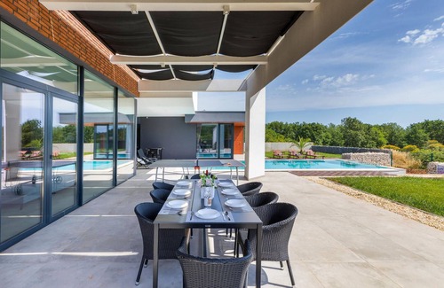This architecturally impressive holiday home is close to the sea and is located on the southernmost tip of Istria in the small fishing village of Linjan. Completed in 2021, the house offers a beautiful view of the sea and the islands of Cres and Loinj. The architecture of this villa has been published by the most prestigious Croatian magazines for design and architecture. The rooms are modernly furnished with lots of light and glass surfaces. The house is suitable for people with disabilities as the entire ground floor has no stairs. The pool is only 2 metres from the bed of the lower room.
