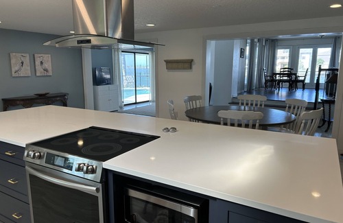 Amenities include a private pool, pool chairs, outdoor TV, central air conditioning, TVs, board games, books, hair dryer, ceiling fans, linens, towels, wireless internet, 'the crows nest' raised deck overlooking the entire wildlife area, dock slip, beach chairs, outdoor dining area, gas grill, and full kitchen equipped with an electric oven/stove, refrigerator, freezer, dishwasher, microwave, pots/pans, blender, ice maker, toaster, coffee maker, spices, and water purifier. **THE HOT TUB DOES NOT WORK AND THE POOL IS NOT HEATED.