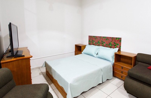 - No quarto/sala há 1 cama de casal, 1 colchão extra de solteiro, armário, edredom / cobertor, protetor de colchão, TV, sofá, poltrona, ventilador de teto, chuveiro elétrico, box de acrílico e secador de cabelo