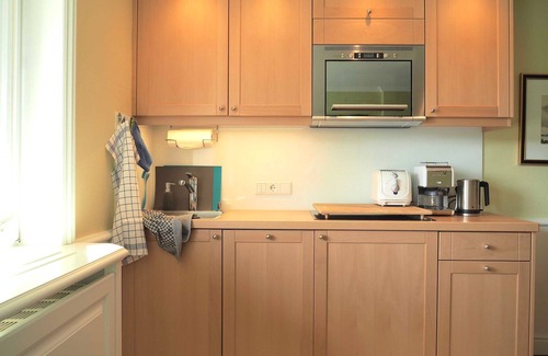 In the living room (with SmartTV, DVD player u. WLAN) is integrated a complete kitchenette with dishwasher, microwave, coffee maker, hot water kettle u. Toaster.
