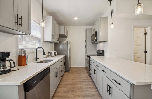 Modern Kitchen with Stainless Steel Appliances – Includes a dishwasher, microwave, fridge, and more – everything you need to cook at home.