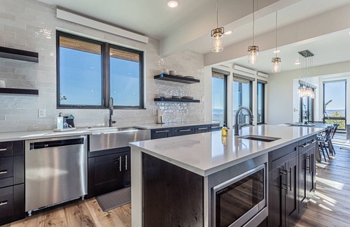 Cook and dine with the incredible landscapes as the backdrop. The well-designed, fully stocked, professional kitchen features brand new Bosch stainless appliances, including a six burner gas range, gorgeous quartz countertops, a large farmhouse sink plus bonus prep sink on the kitchen island and beautiful cabinetry. There is a large walk-in pantry and the property has everything you will need to cook a meal including small appliances, cookware, dinnerware, utensils and more.
