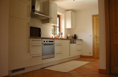 The lovingly furnished stone house extends over 2 floors with a large living area, open kitchen, bathroom and two bedrooms on the upper floor. On the ground floor, sliding doors bring summer into the house and offer an enchanting view of the swimming pond in every season. A pellet stove and the cozy seating area ensure pleasant hours in the evening. The open kitchen is equipped with a dishwasher and all accessories. The high-quality equipment with French terracotta tiles, marble mosaic tiles in the bathroom, the oak parquet in the 2 bedrooms and the selected furnishings with comfortable box spring beds ensure a pleasant stay and restful sleep.