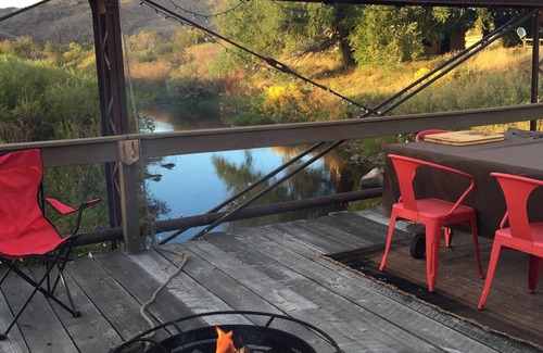 Join us in watching incredible sunsets on the farmhouse porch while Red Tail Hawks circle above the prairie, take part in the new west. The Sundance Room is on the second floor of the Inn which is a renovated 1894 Farmhouse. We are located on the North Fork of the Cache La Pouder River Valley. Fly fishing is available out the back door. There are many areas to enjoy during your stay, a wood fired sauna, hot tub, historic iron bridge and a healthy breakfast.