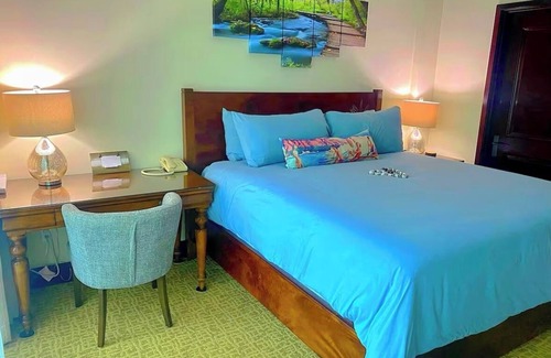This suite features Koa wood and luxury spa like bedding. 1 King and 2 Queen Beds+Sofa Sleeper + Work Desk. Mahogany wood décor and furnishings, 2 large Jacuzzi soaking tubs- glass Travertine showers + lot of space!