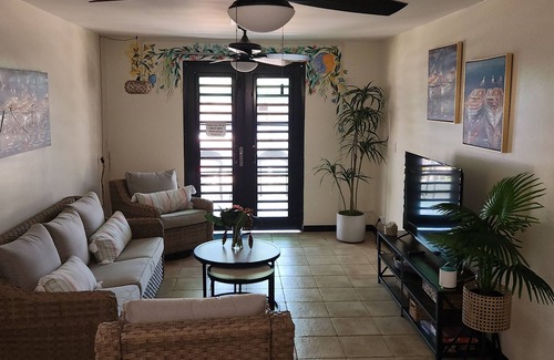 Welcome to the best neighborhood in Luquillo, and your just steps away from one of the most beautiful beaches in Puerto Rico. Many new improvements, all new furniture, bedding, A/C's, washer & dryer. Beautiful ocean view from the front covered lanai. We offer 2 large bedrooms, master with a king sized bed and large 2nd bedroom has 1 queen and twin trundle beds. Great for family's or just the two of you for a quiet romantic getaway.