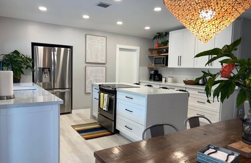 The house includes three bedrooms and two bathrooms, along with a living room, three desks with chairs, and ample greenery throughout. You will love the newly renovated kitchen, which includes seating on the island. We hope you enjoy your stay!