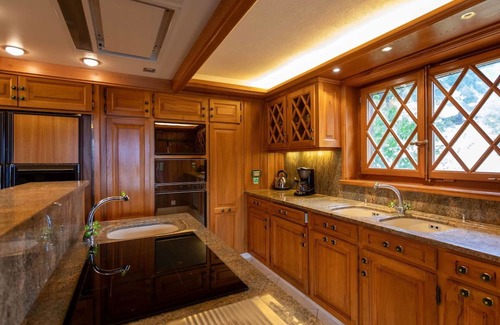 Your vacation home comes fully equipped with modern conveniences including a washing machine, dishwasher, open-hearth fireplace, heat availability, microwave, and multiple televisions. The open kitchen features four induction hot plates, a toaster, kettle, freezer, and electric coffee machine. The chalet can accommodate up to 10 guests across its 6 bedrooms and 4 bathrooms. Each bedroom is furnished with comfortable double beds, and multiple bathrooms feature bidets and double hand-basins.