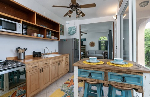 Rent the entire villa (5 bedrooms/sleeps 10 comfortably) or rent half of the house for smaller groups that sleeps 4-6! This property has 2 beautifully appointed areas; giving you your own space, yet giving you the opportunity for extended families/parties to be together! The large sweeping porch with endless beautiful views will take your breath away! Come as adults only or use the home as family friendly! Lots of parking on a nice flat driveway, no need for 4x4. Make some memories at this unique location, just 5 mins outside of Cruz Bay on a private road. Fully Home AC - This villa has new furnishings and decor, and newer to the short term rental market. Solar with battery back-up!