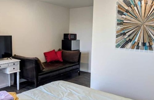 The room has a separate entrance, 1 queen bed, and a full-size futon couch, a private bathroom, and is equipped with a fridge, microwave, TV, and more! Perfect for 1-3 guests.