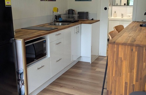 The kitchenette has an induction cooktop, microwave, full fridge/freezer, kettle & toaster.