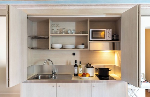 The guest will be available: microwave, induction stove, set of pots, plates and cutlery, Nespresso coffee machine, Nespresso coffee machine, tea kettle, toaster, juicer and a full range of cups and cooking utensils.