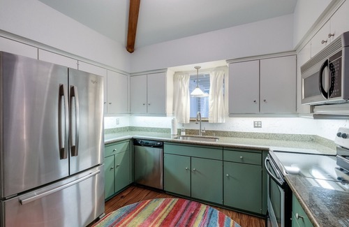 Enjoy this peaceful and centrally-located home near Alamo Heights. Quiet back yard with sliding door access to pack yard with covered patio with table and chairs from Bed 2 ; charming patio area with sliding door access from living room with fire pit, table and chairs. Bedroom 1 also has sliding door access to back yard with ensuite bath. Bed 3 has pull out daybed with 2 twin beds. Kitchen is stocked with Keurig coffee pot and a tea kettle! Living room 2 is off kitchen with pull out sofa. Enjoy the tranquil neighborhood with an evening stroll or take a yoga mat out to one of the outdoor areas.