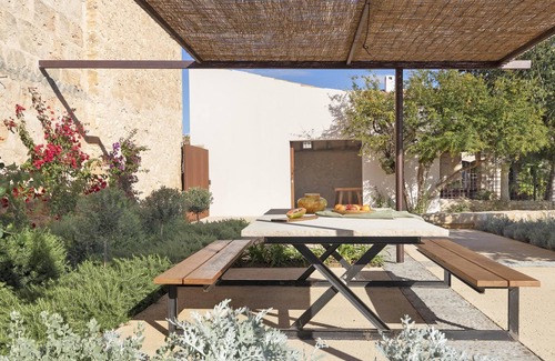 Cas Padrins looks like a green oasis where you can recharge your batteries once again. The typical Mediterranean vegetation creates a sense of serenity. The beautiful old fountain in the courtyard of the town house tells of times long gone on the sun-drenched island. Make yourself comfortable at the pool, which is particularly impressively designed and framed with wooden planks, and listen to the sound of the fountain or simply enjoy the view of the hilly landscape. But there are also shady spots under the pergola, and in the evening you can enjoy the grilled delicacies that you may have brought fresh from one of your trips.In the extremely stylishly renovated interior of the town house Cas Padrins, the quarry stone walls typical of Mallorca were skilfully staged. Beautiful beamed ceilings give the town house an appealing flair. The selected modern furnishings contrast wonderfully with the warm colors of the wooden furniture, which, together with the few hand-picked accessories, set lively accents. The spacious, bright kitchen that opens onto the garden makes you want to enjoy lively cooking events with family or friends. Everyone can sit down at the large wooden table to enjoy a delicious dinner in cooler weather. The dining area merges into the open living room with its cozy sofa area. With the effective lighting, you can spend cozy evenings here. In a small work area, you could complete the necessary correspondence — but only if absolutely necessary. If you like, you can also retreat to the garden lounge with large panoramic windows. Make yourself comfortable on the colorful sofas or serve a balanced lunch snack here at the exclusive wooden table. One of the five bedrooms and the guest toilet are located on the ground floor, while the other four bedrooms are spread over the upper floor. All bedrooms have a modern ensuite bathroom. Two of the bedrooms on the upper level have a special highlight, a sun-drenched private terrace from which you can enjoy the view of the beautiful landscape with a cold drink. The air conditioning system at Cas Padrins ensures a pleasant indoor climate.