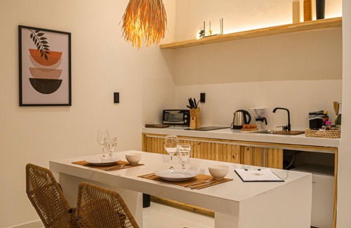 The kitchen is equipped with an oven, a stovetop, and a refrigerator, as well as an electric kettle and cookware. In addition, there's a jetted tub, along with a bidet, towels, and shampoo. Other amenities include bed sheets and air conditioning.