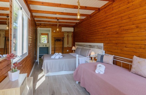 The four cabins are located near the main building and surrounded by lush vegetation. They are characterised by the same design: each of them features wooden walls, spacious windows, a double bed and a single bed, and a modern en-suite with a shower.