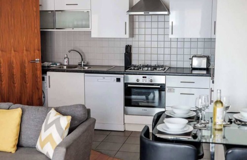 Modern apartment with stylish furniture and fittings. A spacious open plan living, dining and kitchen area. The smart and stylish kitchen area contains all modern appliances. Master bedroom (5ft Kingsize Double) and further bedroom (4ft Small double). Family bathroom (bath with shower over). Laminate solid wood effect flooring throughout.