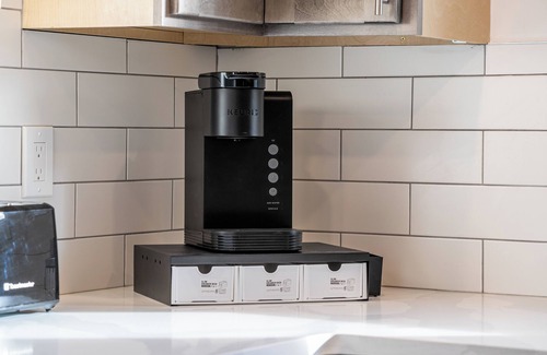 Modern Kitchen: Cook your meals in the fully equipped kitchen, featuring stainless steel appliances, a sleek range hood, and a rustic brick backsplash. Whether you're a culinary enthusiast or prefer simple meals, you'll find everything you need.