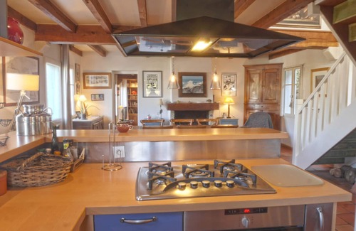 - Une cuisine (7m²) ouverte sur la salle à manger aménagée et très bien équipée (batterie de cuisine, poissonnière, fait tout, piano traditionnel, cafetière Nespresso, mixeur plongeur).