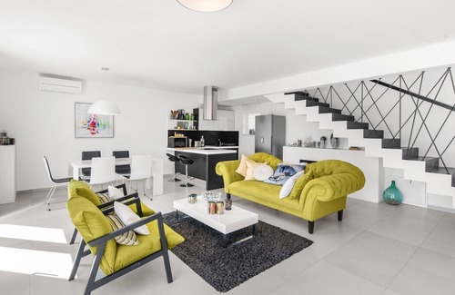 This fully air-conditioned villa has been decorated to the last detail to provide the comfort of your own home. At your disposal, there are two bedrooms with double beds, each with its own en-suite bathroom with a walk-in shower. The spacious ground floor of the house offers a fully equipped modern kitchen for preparing delicious dishes that you can serve on the adjoining dining table. There is also a comfortable living room with glass doors that allow direct access to the yard and unhindered passage of daylight.