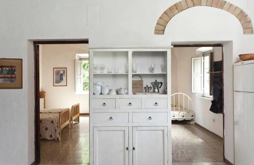 This accommodation has a total area of 110 square meters, and comfortably accommodates up to six people. The comfortable living room leads to a large dining room with a bright equipped kitchen, exposed beams and a large fireplace. The sleeping area consists of three double bedrooms with single beds, one of which with en suite bathroom. The two bathrooms have a sink, toilet and bidet; one has a tub / shower and the other a shower. At the exclusive disposal of guests a pleasant terraced outdoor area with table, chairs, umbrella and barbecue.
