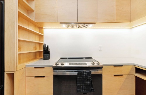 - Full kitchen equipped with custom cabinets by MOD, providing ample storage space