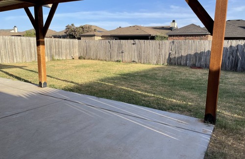 This clean and cozy three-bedroom and two-bath house has new flooring. Not much extravagance here - just a clean place with new beds, mattresses and linens to get a good night's rest while staying in Lubbock. We do the cleaning most of the time ourselves. The driveway can accommodate two vehicles, and street parking is also available. Plenty of front yard and back yard space for family activities. Also a covered patio to get out of the hot sun. Please be aware that, due to the Lubbock's 9% County & City Hotel Occupancy Tax not billed when instantly booking, this HOT tax is billed separately. Feel free to send an inquiry if any questions. Have a blessed day!