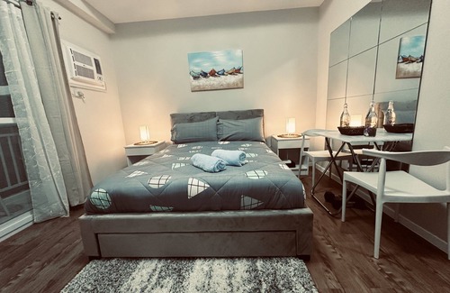 fully airconditioned unit,hot and cold shower,tv with netflix,fast internet,kitchen and cooking are are good to go and a beautiful sunset view in our patio.Just a quick note the gym and the pool are done but for now its not open yet until at the end of this month or early next month.Just a 5mins.drive from the airport.
