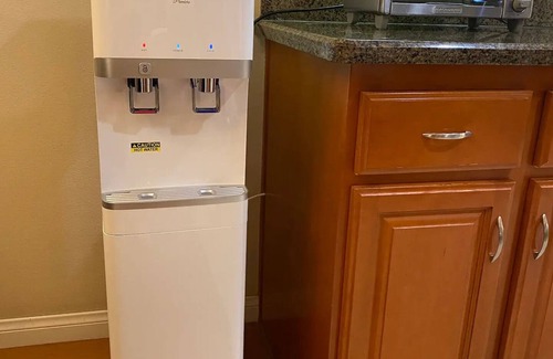 The house has a full kitchen with cook top, microwave, oven, dishwasher, along with coffee maker and toaster. You will also find cooking utensils. The house is equipped with high speed internet, two TV's (master bedroom and living room), filtered drinking water dispenser for cold and hot water, water softener, refrigerator with ice maker, washer and dryer are located in the garage with detergent and dryer sheet provided. Central A/C and heater units will keep the entire home warm or cold for you liking.