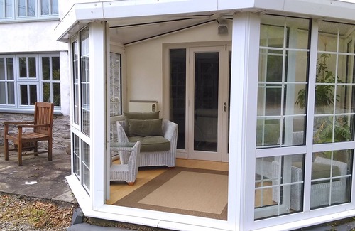 The lounge is furnished with luxurious leather sofas and a matching chair, coffee and side tables, a large TV with Freeview and surround sound and a CD/DVD player. A selection of DVDs, books, games and jigsaws are available for your use. Double patio doors lead into a sunny conservatory with access into the well-established garden.