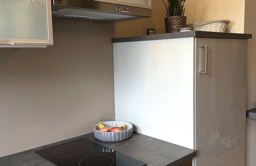 In the kitchen is refrigerator, coffee maker, kettle, crockery available.