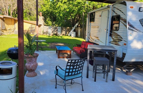 Experience Austin like a local in this enchanting 1-bedroom recreational vehicle. Nestled in the heart of the city, our gorgeous sprawling property offers a cozy and pleasant stay for guests. With heating, AC, and WiFi, you'll have all the comforts you need. The well-designed bedroom ensures a restful night's sleep, while the bathroom provides convenience. Whether you're exploring the vibrant streets or indulging in the local cuisine, our place will help you feel at home while you're traveling in Austin. Cool off steps away in your private swimming pool during the hot Texas summer. Owner resides in house in front of property separate from back yard area. Building adjacent to RV in back yard is for storage only, Not a residence. Perfect for 1 or 2 people for an inexpensive opportunity to visit Austin for any occasion.