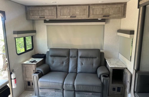 Relax in a haven of comfort and style as you step into this RV. With its spacious layout it can sleep up to 5 people. Equipped with Modern amenities, it's the perfect retreat for families seeking quality time or couples looking for a romantic getaway. Relax in the elegant living area or out in the shade with the awning and trees. Cook in the fully equipped kitchen, and enjoy peaceful nights in the master bedroom's queen-size bed. The Ranch has the best Experience for a Glamping get away!