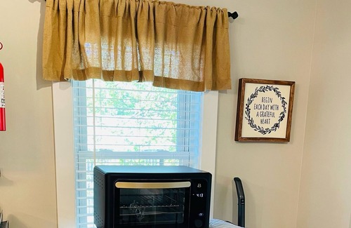 The UPPER LEVEL has a kitchenette that has a double-burner stove top unit. Brand new air fryer that has options to bake, broil or toast. Mini fridge with small freezer compartment. Coffee bar stocked with essentials. Brand new utensils, silverware, pots and pans and other kitchenware. High top table with four stools. Sleeper sofa, radio and Roku TV. Electric air conditioner that provides comfortable coolness to both levels. Baseboard heating that provides comfortable heat.