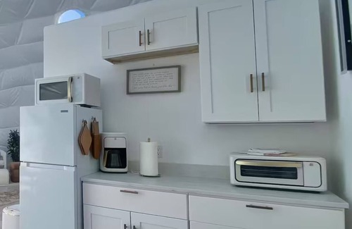 Guests will enter their accommodation through the main lobby (a shared space) and make there way to their private designated dome. The lobby has a a full kitchen featuring a sink, refrigerator, freezer with icemaker, oven with range, and a convenient dishwasher to make cleanup a breeze. Guests who book the entire space will be given access to the laundry room. Each dome has a private separate code for additional safety. The lobby is a shared space and other guests may be utilizing it as well. Guests have a private kitchenette in each dome however, the kitchen sink and dishwasher are located in the lobby space.