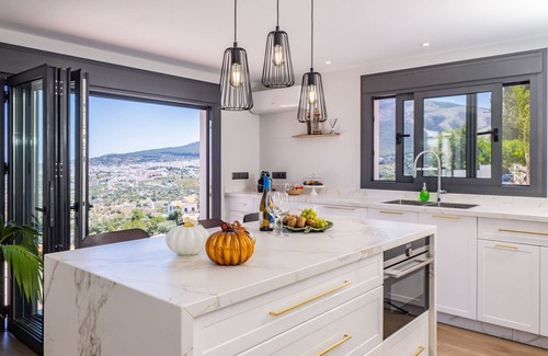 The property is distributed over two floors with a careful and welcoming decoration. On the ground floor you will find a spacious living room with dining area and a modern open-plan kitchen equipped with all the appliances you may need, including fridge, microwave, oven, dishwasher and coffee maker. The central island in the kitchen is the perfect place to cook while enjoying views to the outside. Also on this floor there are two double bedrooms, both with en-suite bathroom — one with bathtub and the other with shower tray — and direct access to the outside, which provides comfort and privacy.