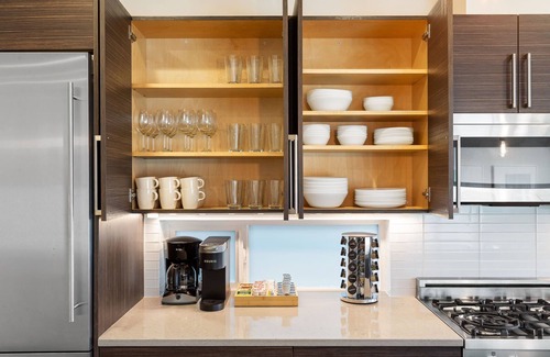 - Fully-stocked kitchen with Keurig coffee maker and coffee pods, pots, pans, bowls, plates, glasses and utensils