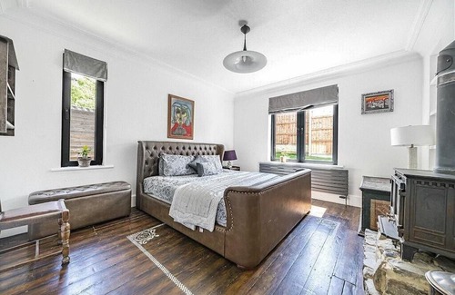 The property offers five bedrooms, providing ample space for up to 12 overnight guests or more upon arrangement. Two of these rooms are equipped with en-suite bathrooms for added convenience and privacy. A special attic room offers an outstanding view of London, the Thames, and a panorama of gardens and trees, serving as a tranquil retreat.