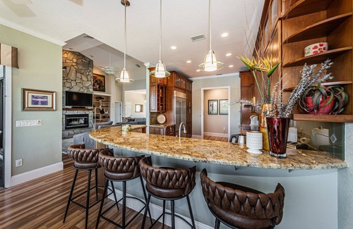Our custom home has been decorated with the comforts of home in mind. You'll find many unique features including a hearty wood burning fireplace for chilly winter evenings. The master king suite is extremely spacious and the luxury ensuite boasts a large soaking tub, double shower heads, rain shower and dual towel heaters. The additional three bedrooms are bright, cheerful and comfortable with easy going beach decor and colors. The spacious kitchen is the heart of the home and features expansive granite counters, high end appliances and a full selection of oils, seasonings and spices for you to prepare your favorite meals and enjoy good times with family and friends.